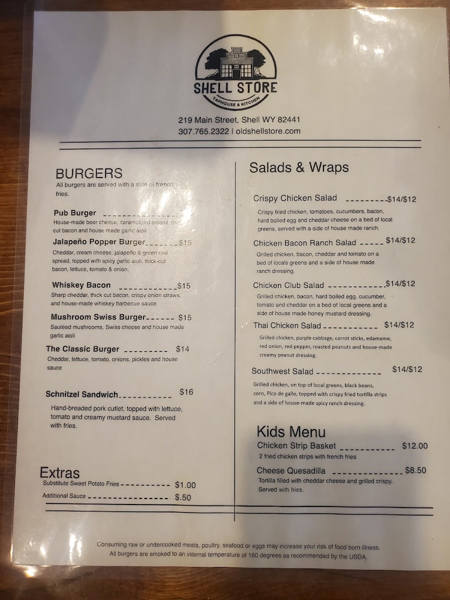 So if you find yourself passing through Shell, or if you’re a local looking for a cozy place to enjoy fantastic food, Old Shell Store - Kitchen & Taphouse is a must-visit destination. You can call ahead at +1 307-765-2322 or simply drop in to experience the unique culinary offerings and the genuine hospitality that awaits you.
